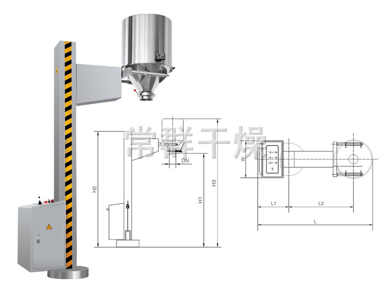 ??TJG 系列固定提升加料機由兩部分組成,即提升機及底座。提升機由機架、液壓提升系統(tǒng)及料門翻轉機構組成。工作時,先將提升機的料門與料桶扣合,啟動提升操作桿,料門與料桶一起上升,啟動翻轉操作桿,料桶即可番轉180度,呈底桶向上姿態(tài)并移動到所需位置,利用料門上出料蝶閥,可很容易將物料加入所需的工藝設備中。